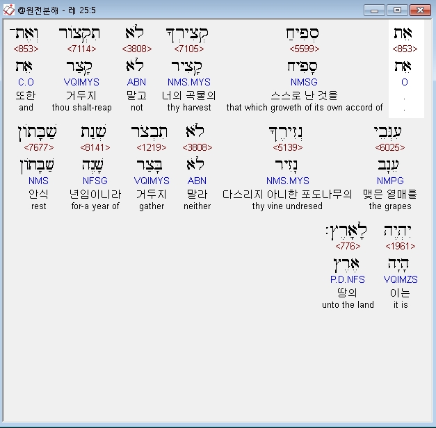 히브리어구약BHS,5 אֵת סְפִיחַ קְצִירְךָ לֹא תִקְצֹור וְאֶת־עִנְּבֵי נְזִירֶךָ לֹא תִבְצֹר שְׁנַת שַׁבָּתֹון יִהְיֶה לָאָרֶץ׃