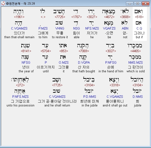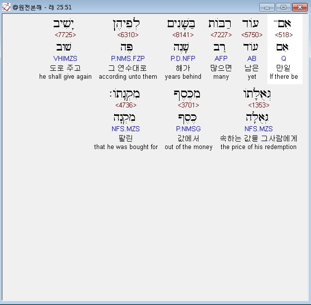 히브리어구약BHS,51 אִם־עֹוד רַבֹּות בַּשָּׁנִים לְפִיהֶן יָשִׁיב גְּאֻלָּתֹו מִכֶּסֶף מִקְנָתֹו׃