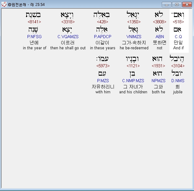 히브리어구약BHS,54 וְאִם־לֹא יִגָּאֵל בְּאֵלֶּה וְיָצָא בִּשְׁנַת הַיֹּבֵל הוּא וּבָנָיו עִמֹּו׃