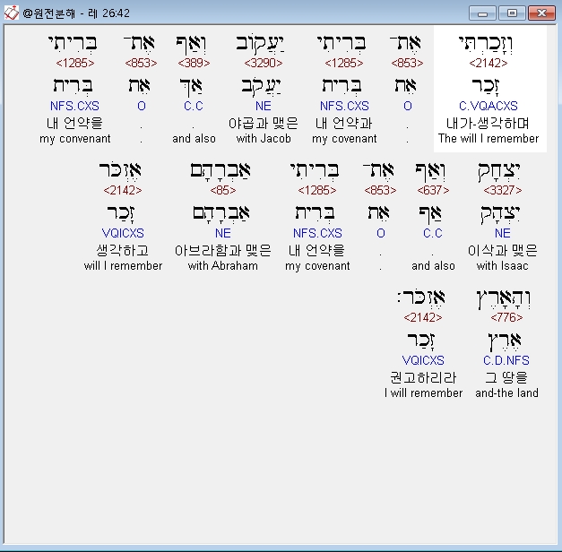 히브리어구약BHS,42 וְזָכַרְתִּי אֶת־בְּרִיתִי יַעֲקֹוב וְאַף אֶת־בְּרִיתִי יִצְחָק וְאַף אֶת־בְּרִיתִי אַבְרָהָם אֶזְכֹּר וְהָאָרֶץ אֶזְכֹּר׃