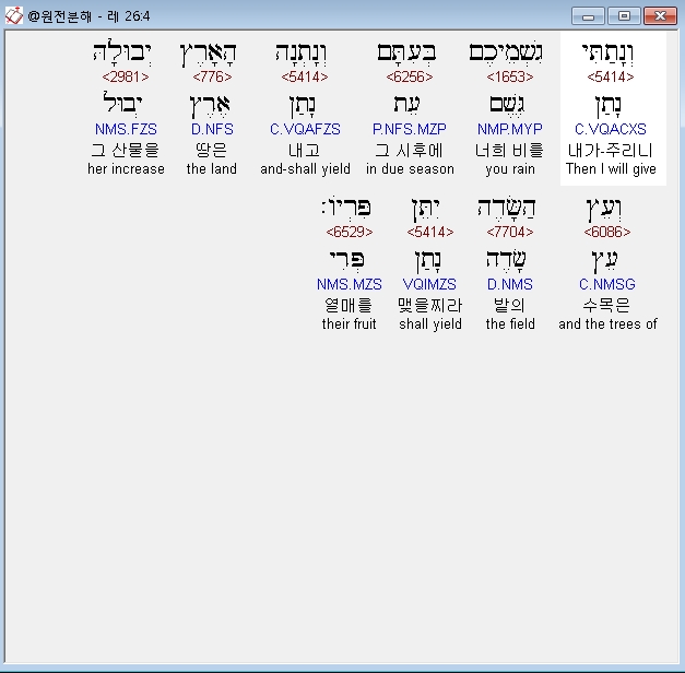헬라어구약Septuagint,4 και δωσω τον υετον υμιν εν καιρω αυτου και η γη δωσει τα γενηματα αυτης και τα ξυλα των πεδιων αποδωσει τον καρπον αυτων