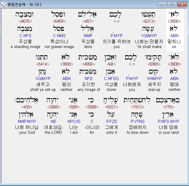 히브리어구약BHS,1 לֹא־תַעֲשׂוּ לָכֶם אֱלִילִם וּפֶסֶל וּמַצֵּבָה לֹא־תָקִימוּ לָכֶם וְאֶבֶן מַשְׂכִּית לֹא תִתְּנוּ בְּאַרְצְכֶם לְהִשְׁתַּחֲוֹת עָלֶיהָ כִּי אֲנִי יְהוָה אֱלֹהֵיכֶם׃