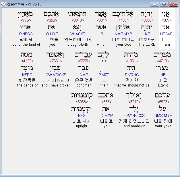 히브리어구약BHS,45 וְזָכַרְתִּי לָהֶם בְּרִית רִאשֹׁנִים אֲשֶׁר הֹוצֵאתִי־אֹתָם מֵאֶרֶץ מִצְרַיִם לְעֵינֵי הַגֹּויִם לִהְיֹת לָהֶם לֵאלֹהִים אֲנִי יְהוָה׃