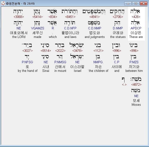 히브리어구약BHS,46 אֵלֶּה הַחֻקִּים וְהַמִּשְׁפָּטִים וְהַתֹּורֹת אֲשֶׁר נָתַן יְהוָה בֵּינֹו וּבֵין בְּנֵי יִשְׂרָאֵל בְּהַר סִינַי בְּיַד־מֹשֶׁה׃ ף