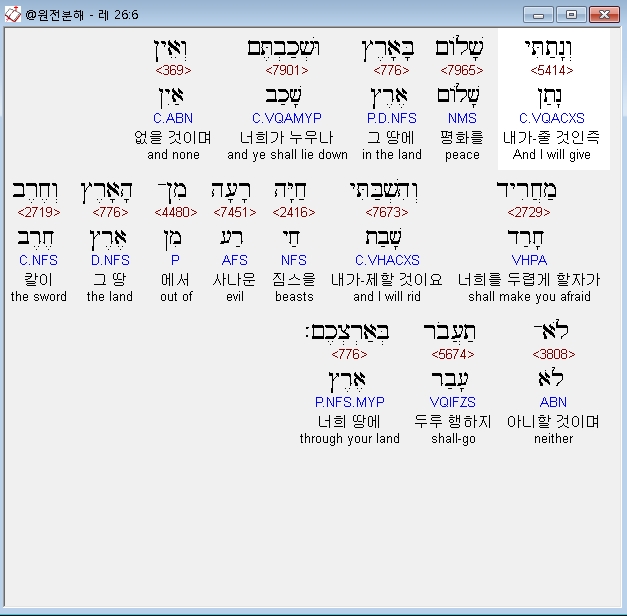 헬라어구약Septuagint,6 και πολεμος ου διελευσεται δια της γης υμων και δωσω ειρηνην εν τη γη υμων και κοιμηθησεσθε και ουκ εσται υμας ο εκφοβων και απολω θηρια πονηρα εκ της γης υμων