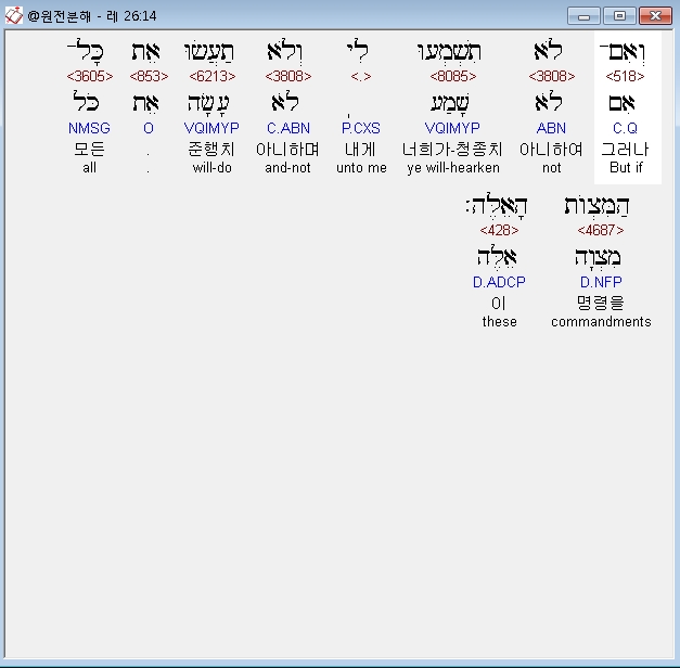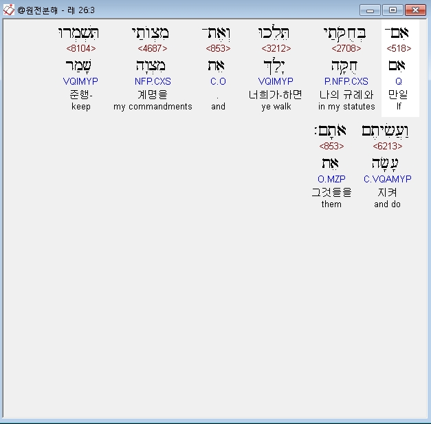 히브리어구약BHS,3 אִם־בְּחֻקֹּתַי תֵּלֵכוּ וְאֶת־מִצְוֹתַי תִּשְׁמְרוּ וַעֲשִׂיתֶם אֹתָם׃