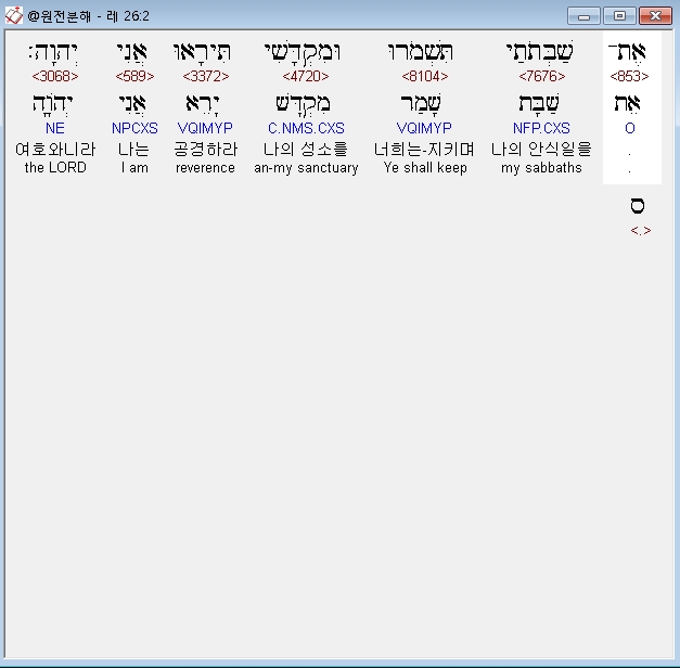 히브리어구약BHS,2 אֶת־שַׁבְּתֹתַי תִּשְׁמֹרוּ וּמִקְדָּשִׁי תִּירָאוּ אֲנִי יְהוָה׃ ס