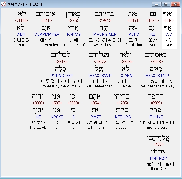히브리어구약BHS,44 וְאַף־גַּם־זֹאת בִּהְיֹותָם בְּאֶרֶץ אֹיְבֵיהֶם לֹא־מְאַסְתִּים וְלֹא־גְעַלְתִּים לְכַלֹּתָם לְהָפֵר בְּרִיתִי אִתָּם כִּי אֲנִי יְהוָה אֱלֹהֵיהֶם׃