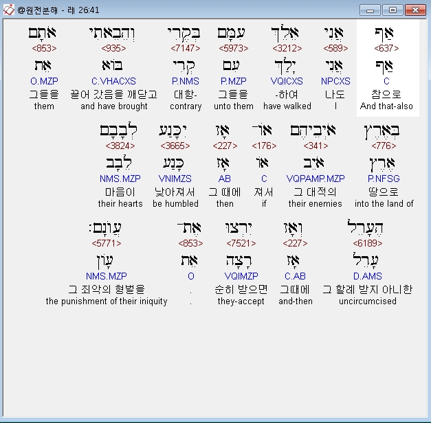 히브리어구약BHS,41 אַף־אֲנִי אֵלֵךְ עִםָּם בְּקֶרִי וְהֵבֵאתִי אֹתָם בְּאֶרֶץ אֹיְבֵיהֶם אֹו־אָז יִכָּנַע לְבָבָם הֶעָרֵל וְאָז יִרְצוּ אֶת־עֲוֹנָם׃