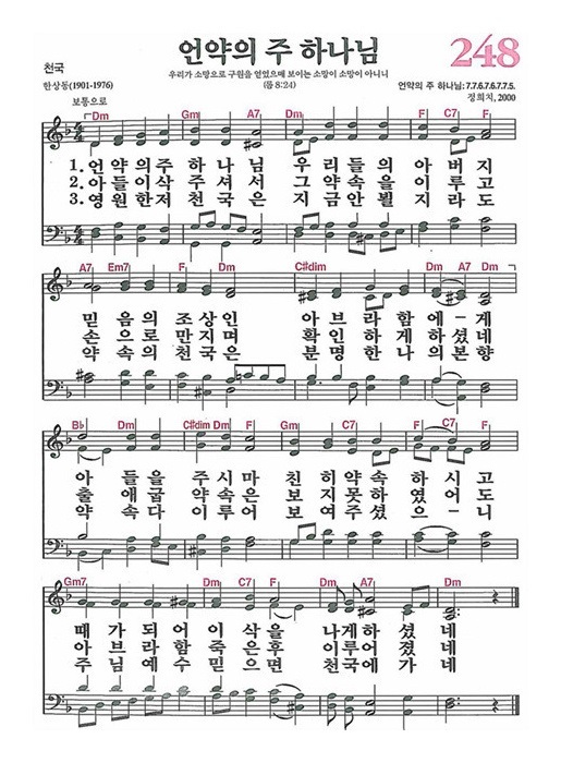 이 찬송은「언약의 주 하나님」이란 제목의 찬송으로서, 아브라함에게 하신 언약을 지키사 이삭을 주셨고,「네 자손이 이방에서 객이 되어 그들을 섬기겠고… 4백년 후 큰 재물을 이끌고 나오리라」하신 언약도 이루셨다. 천국 언약, 지금은 눈에 안 보이지만, 이 언약도 반드시 이루신다는「신구약 요약 찬송」이다.