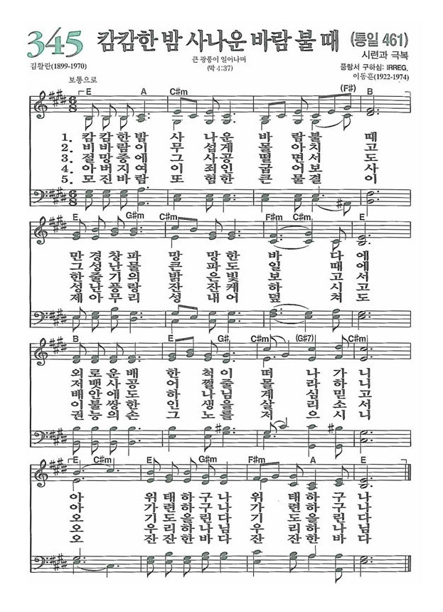 [신정 찬송가](1931년, 126장)에 "캄캄한 밤 쌀쌀한 바람 불 때"로 가사가 처음 수록되었고, [개편 찬송가](1967년, 321장)에 현 곡조와 가사가 함께 처음 수락되었다.