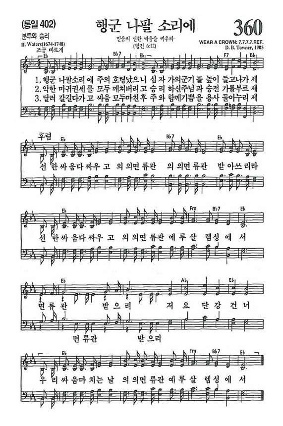[신증 복음가](1919년)에 타우너(Daniel B. Towner, 1850~1919)가 1905년 판권 취득하고 알렉산더(Charles M. Alexander)가 소유자로 되어 있으며, 제목은 "Fight the good fight"(좋은 싸움을 싸우라)로 되어 있다.