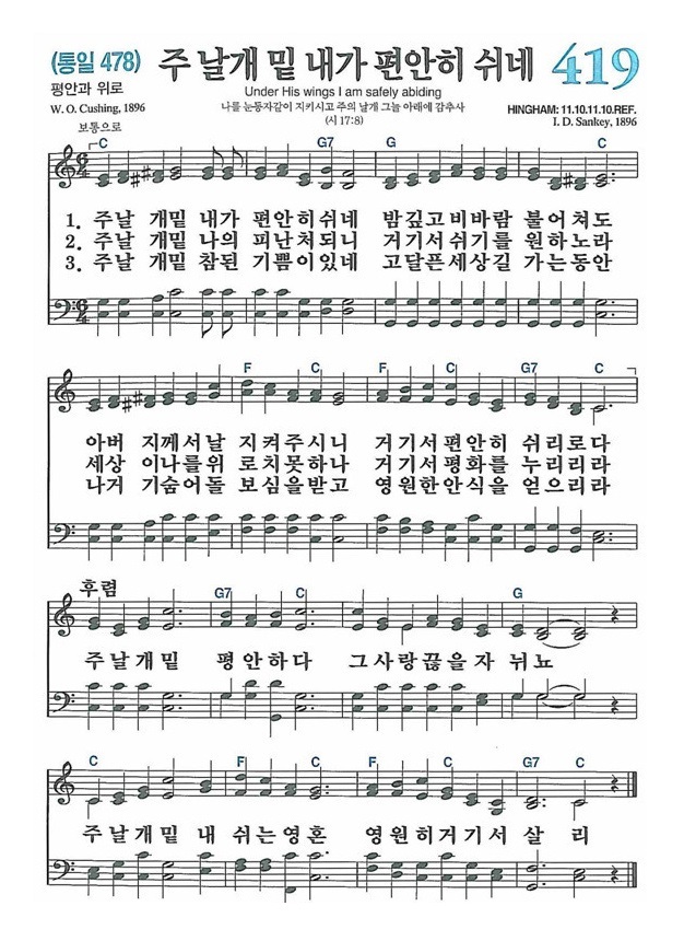 [찬숑가](1908년, 156장)에 첫 줄이 "주 날개 밑 내가 편히 거하네"로 처음 수록되었다.