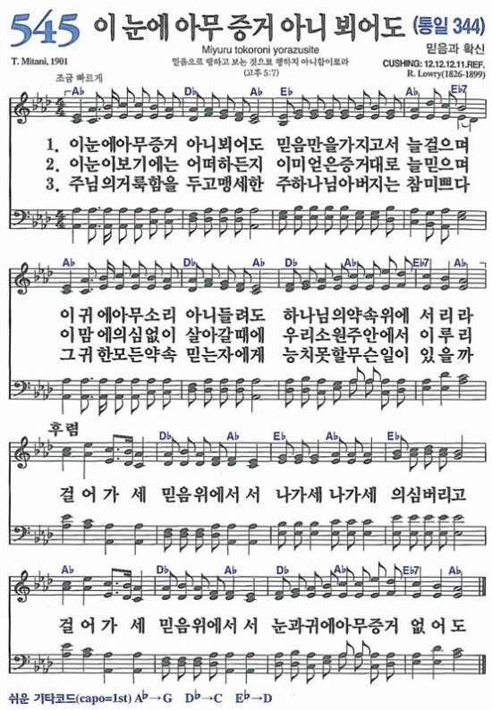 [신증 복음가](1919년, 119장)에 이장하의 번역으로 첫 줄이 "눈에는 아무 증거 안 뵐지라도"로 수록되어 있다.