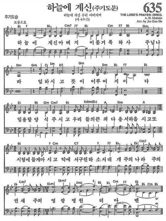 세계적으로 애창되는 앨버트 헤이 말로테(Albert Hay Malotte, 1895~1964) 작곡의「주기도문」합창이다. 이 합창은 부르는 자와 듣는 자 모두에게 깊은 감동을 주는 세계적인 명곡이다. 가사가, 영어로는 주기도문 그대로인데, 우리말로는 많이 다르다. 일본에서는 리듬을 쪼개어서 일어 주기도문에 맞춰 부른다.