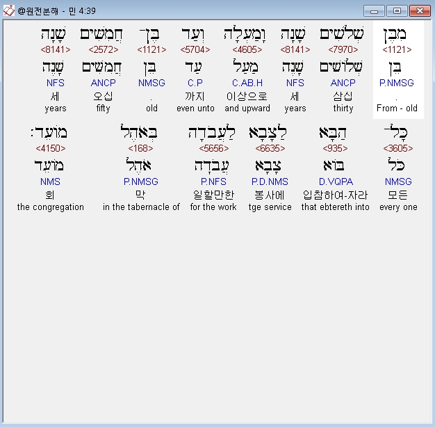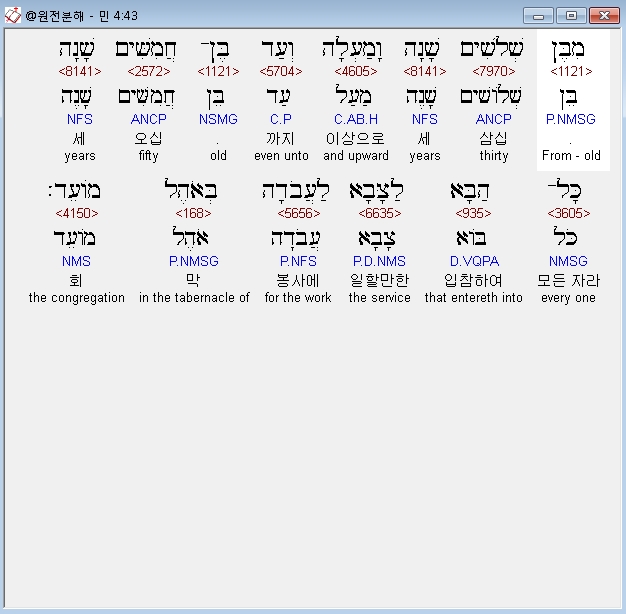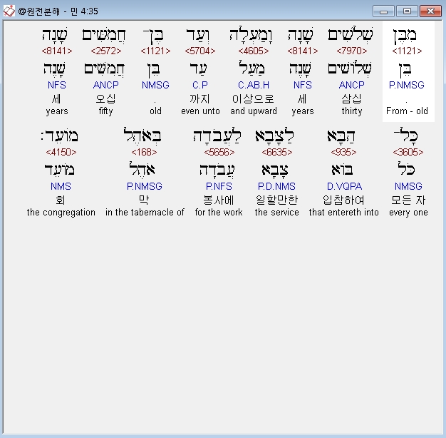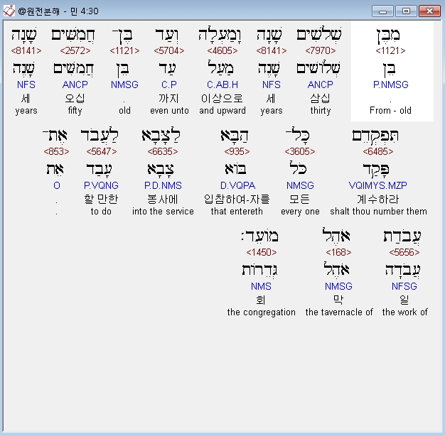 히브리어구약BHS,43 מִבֶּן שְׁלֹשִׁים שָׁנָה וָמַעְלָה וְעַד בֶּן־חֲמִשִּׁים שָׁנָה כָּל־הַבָּא לַצָּבָא לַעֲבֹדָה בְּאֹהֶל מֹועֵד׃