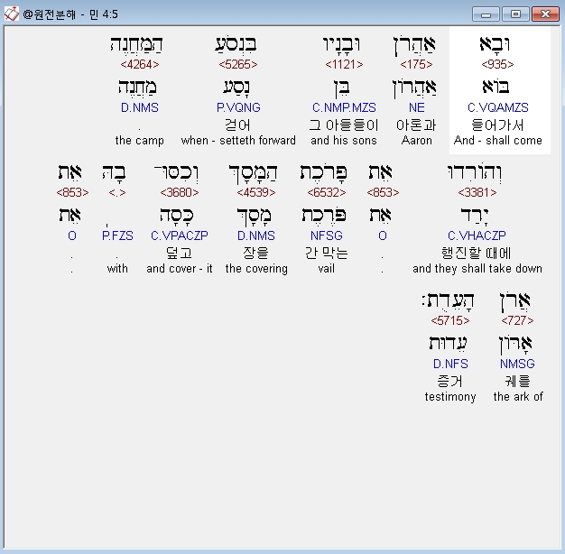 히브리어구약BHS,5 וּבָא אַהֲרֹן וּבָנָיו בִּנְסֹעַ הַמַּחֲנֶה וְהֹורִדוּ אֵת פָּרֹכֶת הַמָּסָךְ וְכִסּוּ־בָהּ אֵת אֲרֹן הָעֵדֻת׃