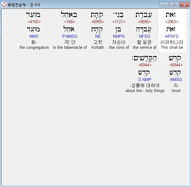 히브리어구약BHS,4 זֹאת עֲבֹדַת בְּנֵי־קְהָת בְּאֹהֶל מֹועֵד קֹדֶשׁ הַקֳּדָשִׁים׃