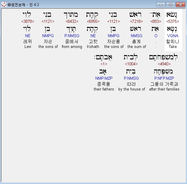 영어NASB,2 "Take a census of the descendants of Kohath from among the sons of Levi, by their families, by their fathers' households,