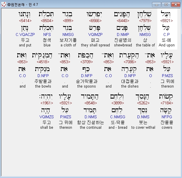 영어NASB,7 "Over the table of the bread of the Presence they shall also spread a cloth of blue and put on it the dishes and the pans and the sacrificial bowls and the jars for the libation, and the continual bread shall be on it.