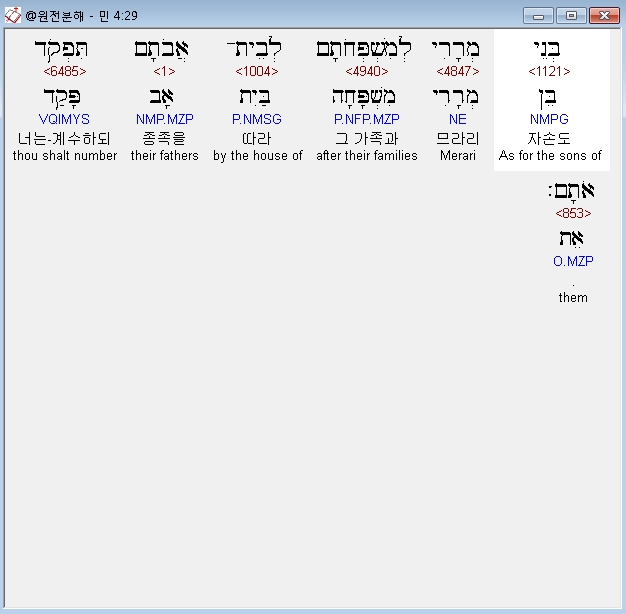 가족과 종족을 따라 - 본절에는 몇 단계의 혈연 집단의 단위가 열거되었다(1:2). (1) '레위 자손'이라 언급된 '자손'(*, 벤)은 '부족', 곧 '지파'(tribe)를 의미한다. (2) '고핫 자손'의 '자손'(*, 벤) 역시 원어로는 (1)과 동일하나, 의미상 '지파'보다는 소규모의 '씨족'(clan)단위를 가리킨다. (3) '가족'(*, 미쉬파하)은 일개 최소 단위인 '가정'(family)을 (4) '종족'(*, ,베트 아보트)은 가족보다는 크고 씨족보다는 작은 단위(subclan)를 가리킨다(1:2). 따라서 의미상 큰 순서대로 나열하면 지파 -> 씨족 -> 종족 -> 가족 순(順)이 된다.