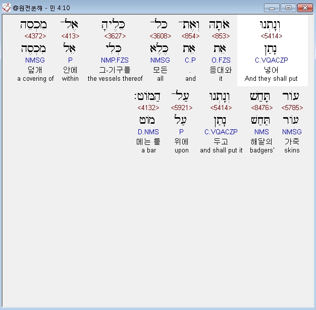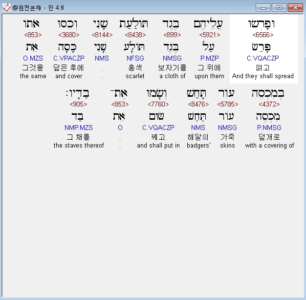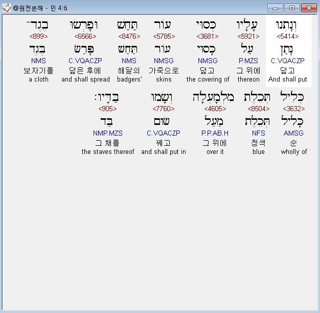 히브리어구약BHS,6 וְנָתְנוּ עָלָיו כְּסוּי עֹור תַּחַשׁ וּפָרְשׂוּ בֶגֶד־כְּלִיל תְּכֵלֶת מִלְמָעְלָה וְשָׂמוּ בַּדָּיו׃