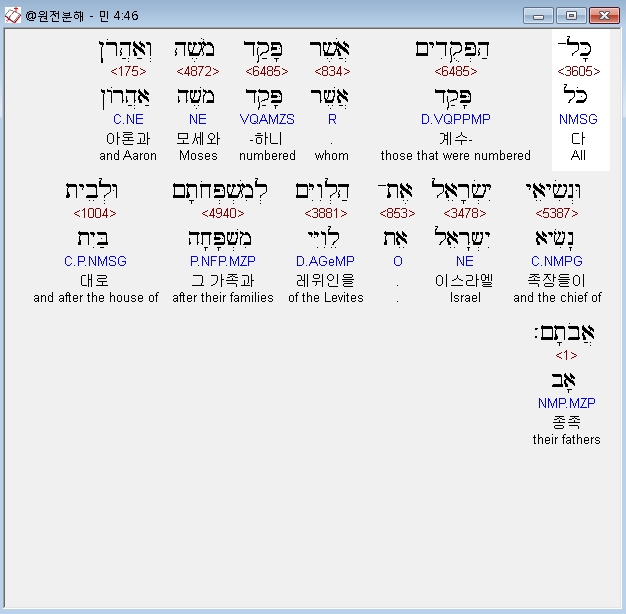 히브리어구약BHS,46 כָּל־הַפְּקֻדִים אֲשֶׁר פָּקַד מֹשֶׁה וְאַהֲרֹן וּנְשִׂיאֵי יִשְׂרָאֵל אֶת־הַלְוִיִּם לְמִשְׁפְּחֹתָם וּלְבֵית אֲבֹתָם׃