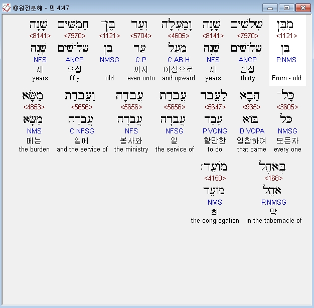 히브리어구약BHS,47 מִבֶּן שְׁלֹשִׁים שָׁנָה וָמַעְלָה וְעַד בֶּן־חֲמִשִּׁים שָׁנָה כָּל־הַבָּא לַעֲבֹד עֲבֹדַת עֲבֹדָה וַעֲבֹדַת מַשָּׂא בְּאֹהֶל מֹועֵד׃