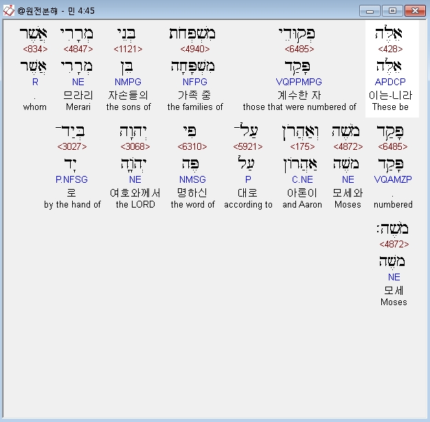 영어NASB,45 These are the numbered men of the families of the sons of Merari, whom Moses and Aaron numbered according to the commandment of the LORD through Moses.