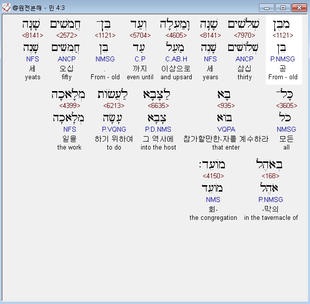 헬라어구약Septuagint,3 απο εικοσι και πεντε ετων και επανω και εως πεντηκοντα ετων πας ο εισπορευομενος λειτουργειν ποιησαι παντα τα εργα εν τη σκηνη του μαρτυριου