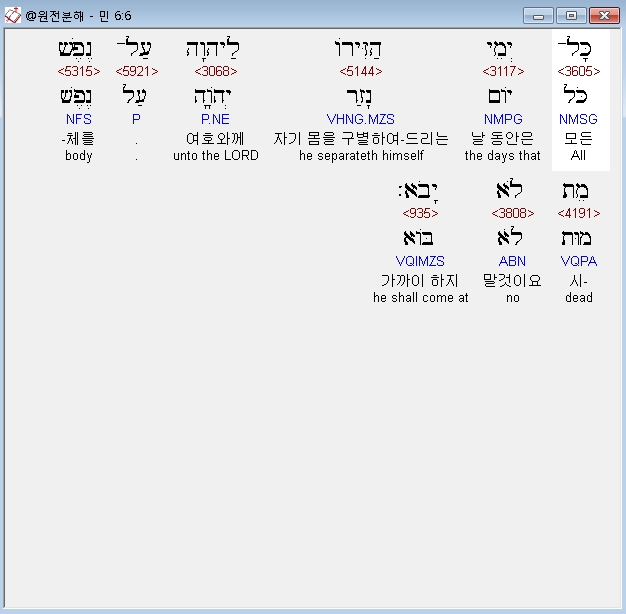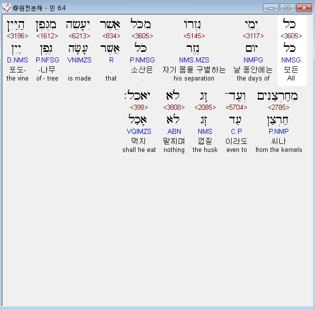히브리어구약BHS,4 כֹּל יְמֵי נִזְרֹו מִכֹּל אֲשֶׁר יֵעָשֶׂה מִגֶּפֶן הַיַּיִן מֵחַרְצַנִּים וְעַד־זָג לֹא יֹאכֵל׃