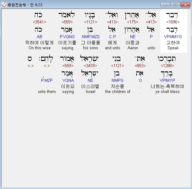 히브리어구약BHS,23 דַּבֵּר אֶל־אַהֲרֹן וְאֶל־בָּנָיו לֵאמֹר כֹּה תְבָרֲכוּ אֶת־בְּנֵי יִשְׂרָאֵל אָמֹור לָהֶם׃ ס