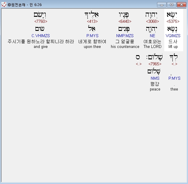 히브리어구약BHS,26 יִשָּׂא יְהוָה פָּנָיו אֵלֶיךָ וְיָשֵׂם לְךָ שָׁלֹום׃ ס