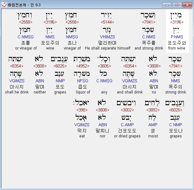 히브리어구약BHS,3 מִיַּיִן וְשֵׁכָר יַזִּיר חֹמֶץ יַיִן וְחֹמֶץ שֵׁכָר לֹא יִשְׁתֶּה וְכָל־מִשְׁרַת עֲנָבִים לֹא יִשְׁתֶּה וַעֲנָבִים לַחִים וִיבֵשִׁים לֹא יֹאכֵל׃