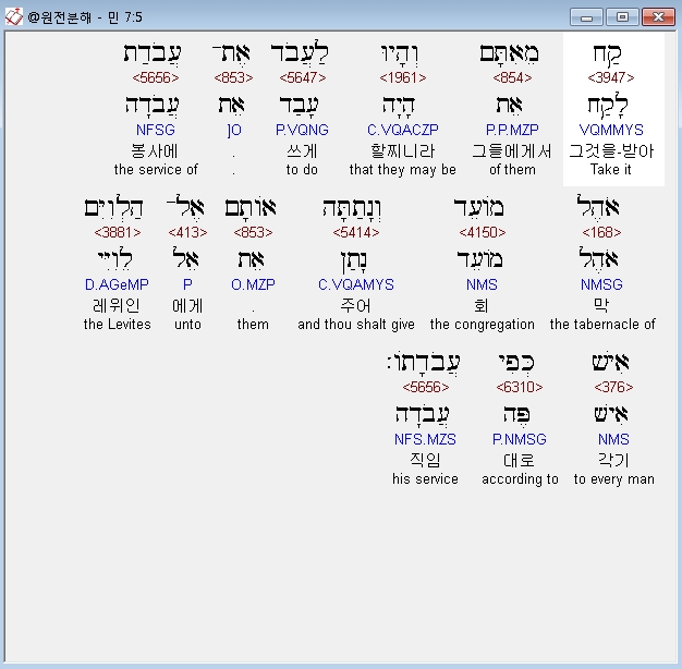 헬라어구약Septuagint,5 λαβε παρ' αυτων και εσονται προς τα εργα τα λειτουργικα της σκηνης του μαρτυριου και δωσεις αυτα τοις λευιταις εκαστω κατα την αυτου λειτουργιαν