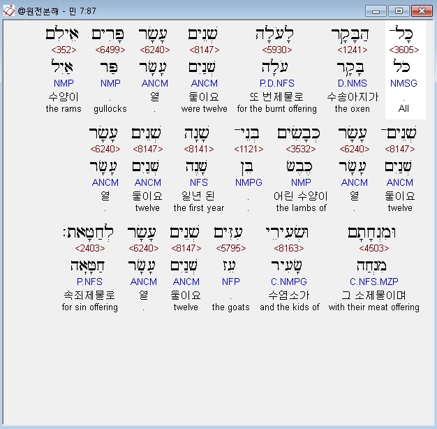헬라어구약Septuagint,87 πασαι αι βοες εις ολοκαυτωσιν μοσχοι δωδεκα κριοι δωδεκα αμνοι ενιαυσιοι δωδεκα και αι θυσιαι αυτων και αι σπονδαι αυτων και χιμαροι εξ αιγων δωδεκα περι αμαρτιας