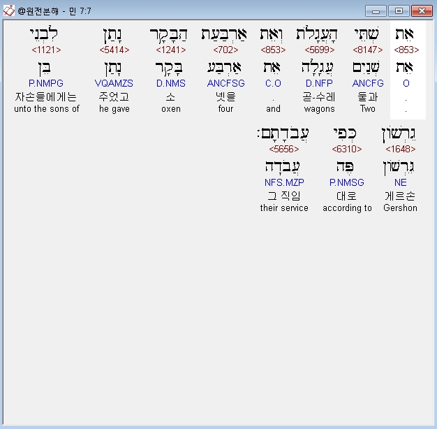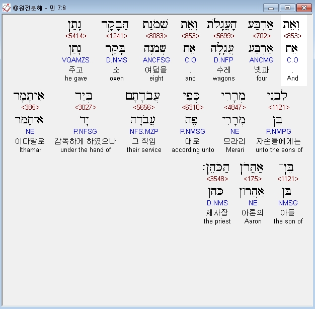 헬라어구약Septuagint,6 και λαβων μωυσης τας αμαξας και τους βοας εδωκεν αυτα τοις λευιταις