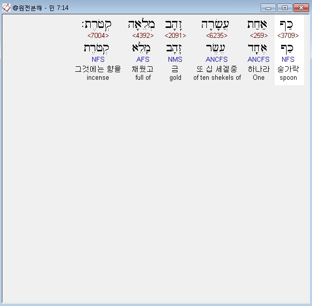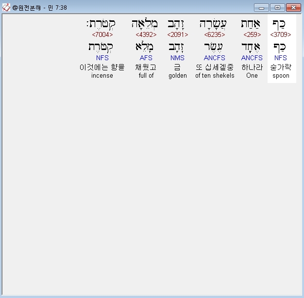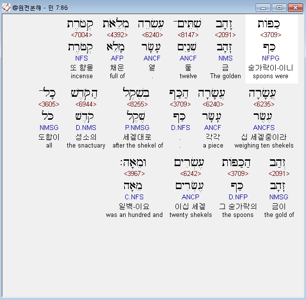 히브리어구약BHS,86 כַּפֹּות זָהָב שְׁתֵּים־עֶשְׂרֵה מְלֵאֹת קְטֹרֶת עֲשָׂרָה עֲשָׂרָה הַכַּף בְּשֶׁקֶל הַקֹּדֶשׁ כָּל־זְהַב הַכַּפֹּות עֶשְׂרִים וּמֵאָה׃