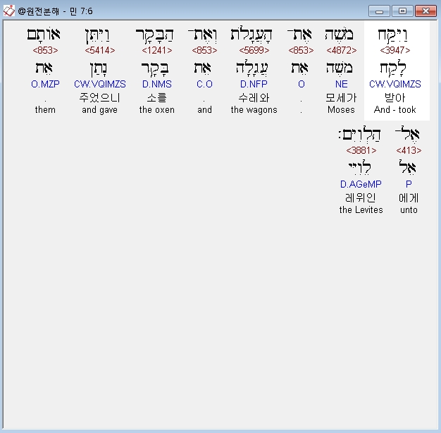 히브리어구약BHS,6 וַיִּקַּח מֹשֶׁה אֶת־הָעֲגָלֹת וְאֶת־הַבָּקָר וַיִּתֵּן אֹותָם אֶל־הַלְוִיִּם׃