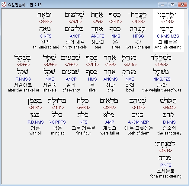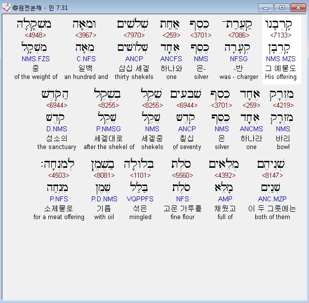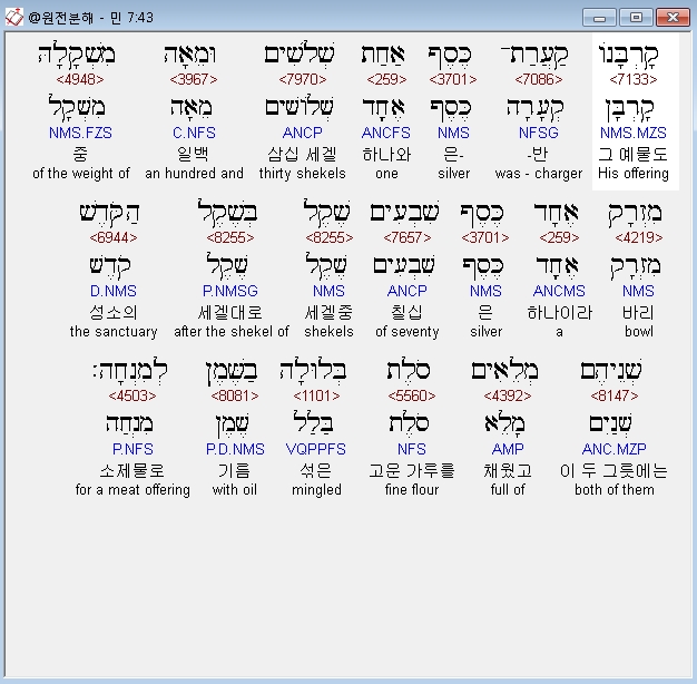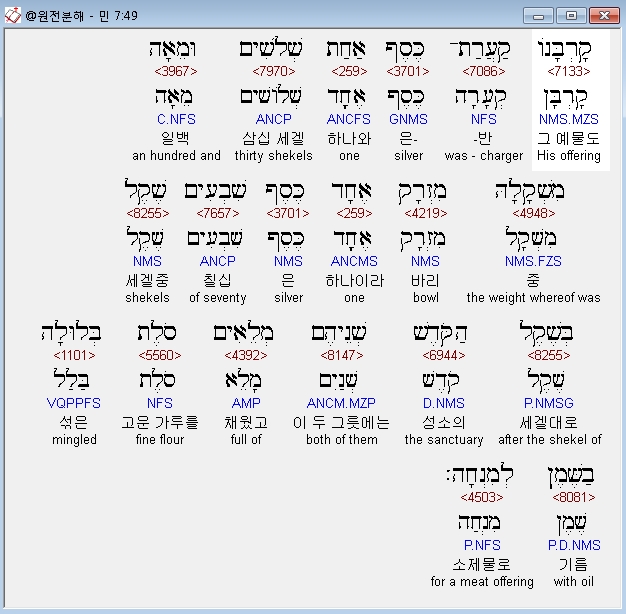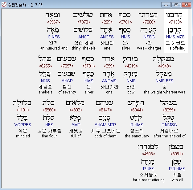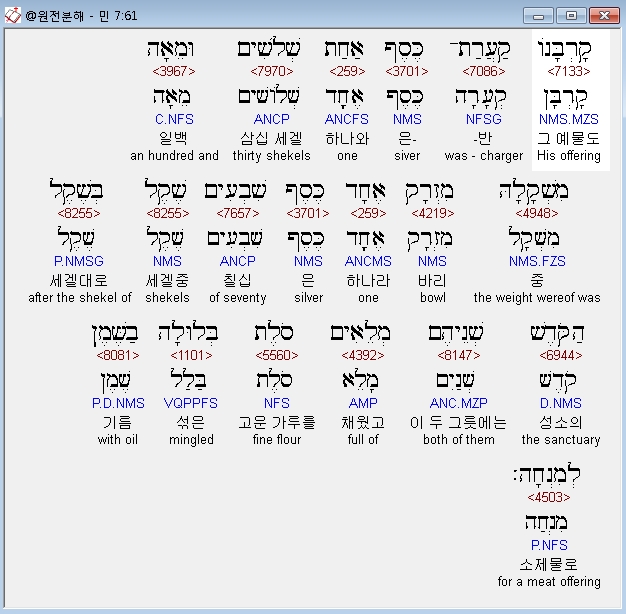 히브리어구약BHS,85 שְׁלֹשִׁים וּמֵאָה הַקְּעָרָה הָאַחַת כֶּסֶף וְשִׁבְעִים הַמִּזְרָק הָאֶחָד כֹּל כֶּסֶף הַכֵּלִים אַלְפַּיִם וְאַרְבַּע־מֵאֹות בְּשֶׁקֶל הַקֹּדֶשׁ׃