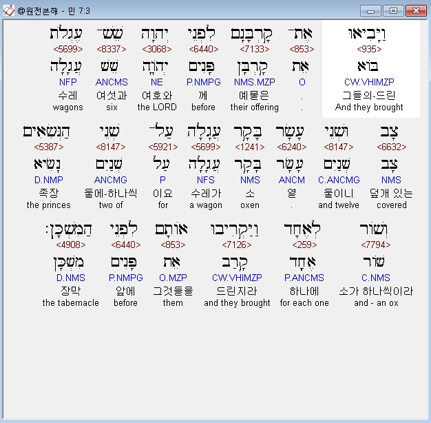 히브리어구약BHS,3 וַיָּבִיאוּ אֶת־קָרְבָּנָם לִפְנֵי יְהוָה שֵׁשׁ־עֶגְלֹת צָב וּשְׁנֵי עָשָׂר בָּקָר עֲגָלָה עַל־שְׁנֵי הַנְּשִׂאִים וְשֹׁור לְאֶחָד וַיַּקְרִיבוּ אֹותָם לִפְנֵי הַמִּשְׁכָּן׃