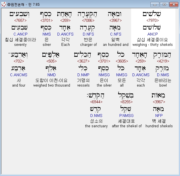 헬라어구약Septuagint,85 τριακοντα και εκατον σικλων το τρυβλιον το εν και εβδομηκοντα σικλων η φιαλη η μια παν το αργυριον των σκευων δισχιλιοι και τετρακοσιοι σικλοι εν τω σικλω τω αγιω