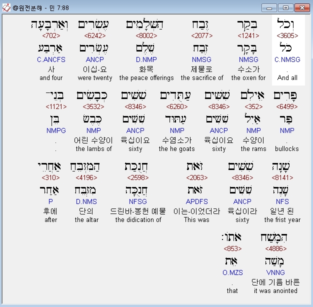 영어NASB,88 and all the oxen for the sacrifice of peace offerings 24 bulls, all the rams 60, the male goats 60, the male lambs one year old 60. This was the dedication offering for the altar after it was anointed.