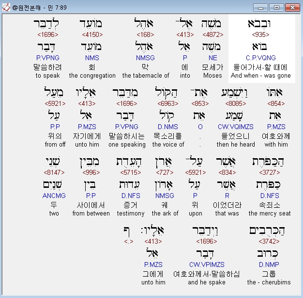 영어NASB,89 Now when Moses went into the tent of meeting to speak with Him, he heard the voice speaking to him from above the mercy seat that was on the ark of the testimony, from between the two cherubim, so He spoke to him.