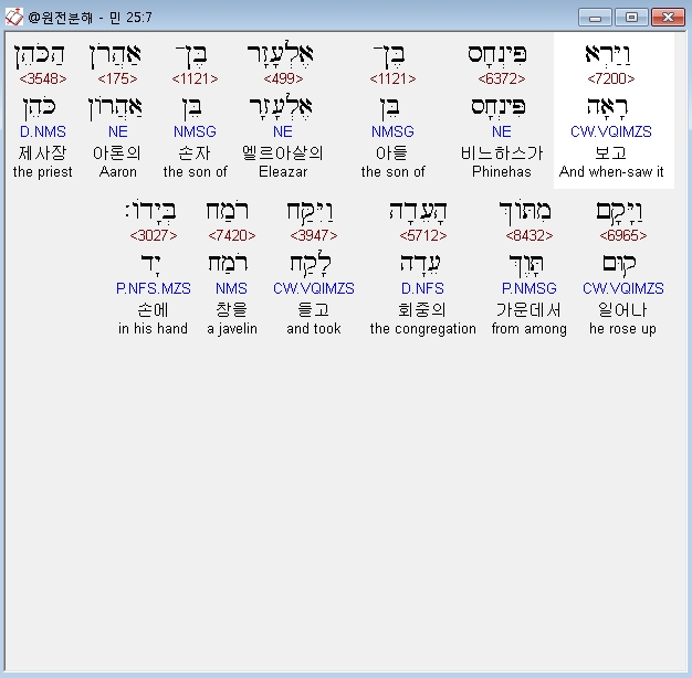 히브리어구약BHS,6 וְהִנֵּה אִישׁ מִבְּנֵי יִשְׂרָאֵל בָּא וַיַּקְרֵב אֶל־אֶחָיו אֶת־הַמִּדְיָנִית לְעֵינֵי מֹשֶׁה וּלְעֵינֵי כָּל־עֲדַת בְּנֵי־יִשְׂרָאֵל וְהֵמָּה בֹכִים פֶּתַח אֹהֶל מֹועֵד׃