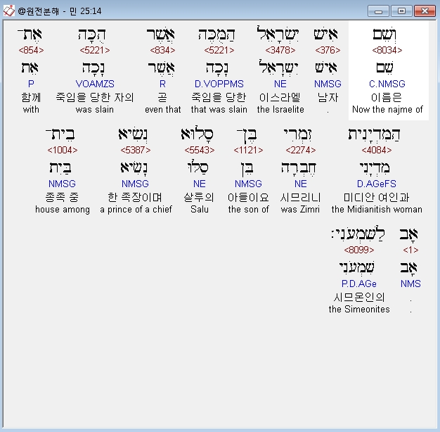 영어MSG,14 The name of the man of Israel who was killed with the Midianite woman was Zimri son of Salu, the head of the Simeonite family.