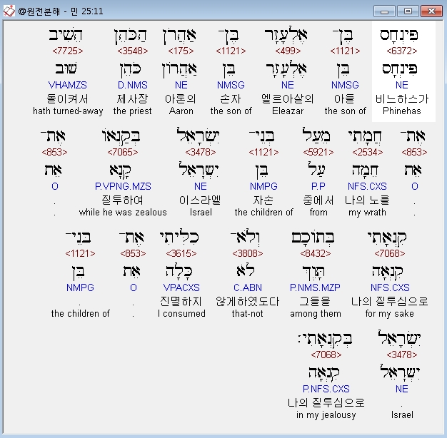 속죄하였음이니라 - 이 말은 비느하스의 의분(義憤)이 이스라엘 백성의 죄를 사하는 속죄 능력의 근원이라는 뜻은 아니다. 이것은 하나님께서 패역한 범죄자를 살해했던 비스하스의 의분을 이스라엘의 죄를 속하는 속죄 수단으로 받아들이시사 당신의 진노를 거두셨다는 뜻이다. 이처럼 언제나 속죄의 주체는 하나님이시다(시 25:18).