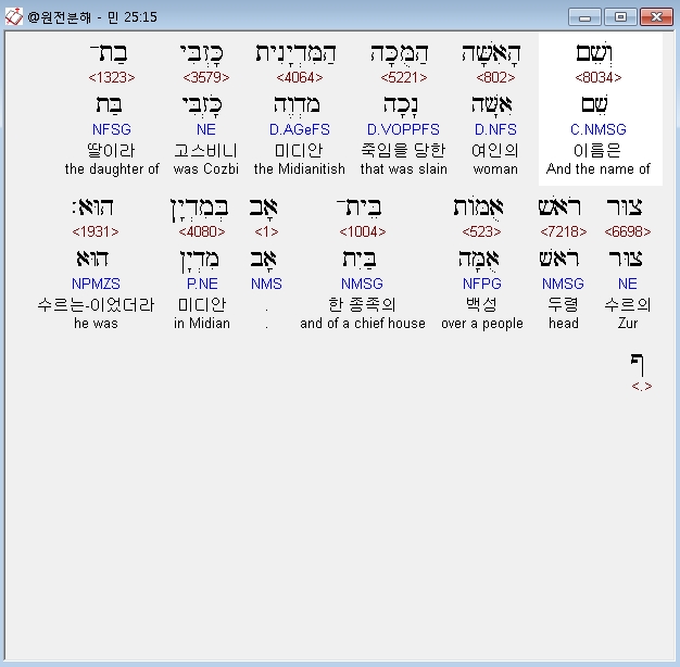 영어MSG,15 And the name of the Midianite woman who was killed was Cozbi daughter of Zur, a tribal chief of a Midianite family.