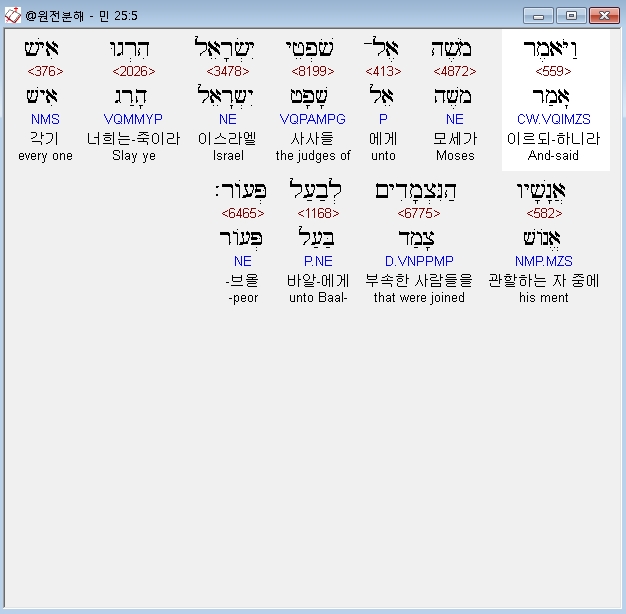 히브리어구약BHS,5 וַיֹּאמֶר מֹשֶׁה אֶל־שֹׁפְטֵי יִשְׂרָאֵל הִרְגוּ אִישׁ אֲנָשָׁיו הַנִּצְמָדִים לְבַעַל פְּעֹור׃