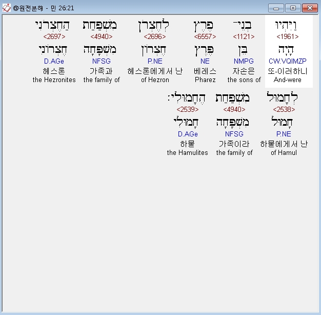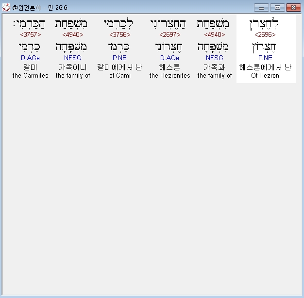 히브리어구약BHS,6 לְחֶצְרֹן מִשְׁפַּחַת הַחֶצְרֹונִי לְכַרְמִי מִשְׁפַּחַת הַכַּרְמִי׃